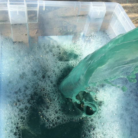 Gently remove the excess liquid, we call it the "supernatant" above the indigo pigment and set aside. Pour out the pigment. Add water to half the volume of water used in the alchemy process, this is to rinse and remove the odour of the lime. Allow the pigment to settle once more.